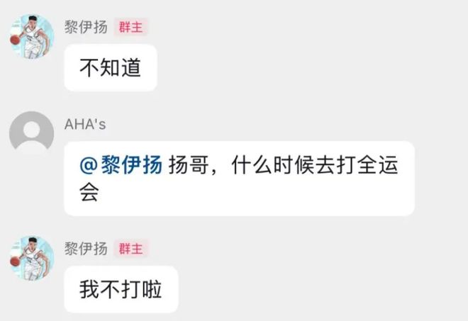 廣東隊(duì)“三張”落選不意外,但這幾位還是有些許機(jī)會(huì)能參加后面的比賽(假如后續(xù)需要輪換或者有球員出現(xiàn)傷?。鴣?lái)自福建男籃的黎伊揚(yáng)的落選,則可能是真的來(lái)不了了,有球迷在論壇評(píng)論區(qū)曬出了一張和黎伊揚(yáng)交流的截圖,問(wèn)黎伊揚(yáng)什么時(shí)候打全運(yùn)會(huì),黎伊揚(yáng)回復(fù):“我不打啦”,言外之意,要么是廣東后衛(wèi)線人手充足,要么就是福建男籃不放人。