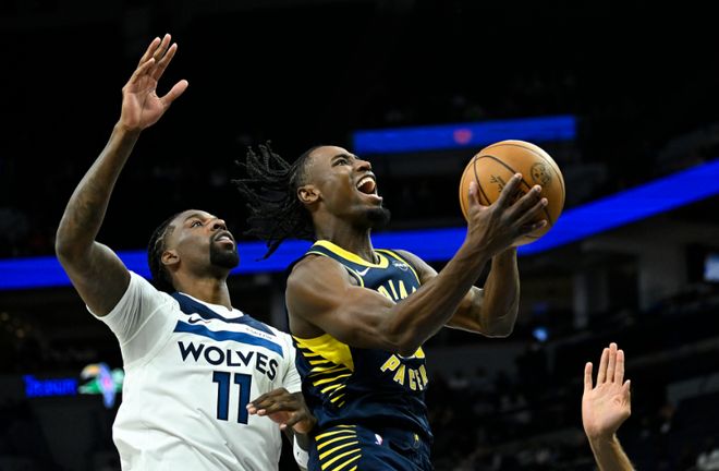 森林狼上一場季前賽126-116戰(zhàn)勝掘金,步行者核心哈利伯頓因傷報(bào)銷,休賽期交易送走特納。本場森林狼迎來愛德華茲、蘭德爾與康利復(fù)出,步行者缺少哈利伯頓。首節(jié)開局杰克遜2分鐘3犯規(guī)被換下場,步行者在6-7短暫落后情況下,很快多點(diǎn)開花打出一波19-7攻勢反超11分。愛德華茲外線三分開火率隊(duì)追到差3分,步行者隨后再度拉開比分,首節(jié)結(jié)束步行者37-29領(lǐng)先森林狼。