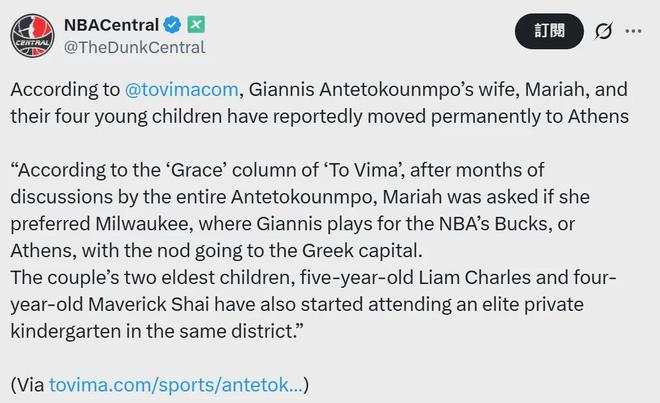 據(jù)希臘主流紙媒《To Vima》報(bào)道,經(jīng)過字母哥一家數(shù)月的討論后,字母哥的妻子瑪利亞選擇帶著4個(gè)孩子搬離密爾沃基,回到希臘首都雅典居住,字母哥的兩個(gè)大兒子——五歲的Liam-Charles和四歲的Maverick-Shai——都已經(jīng)在雅典的一所精英私立幼兒園上學(xué)了。