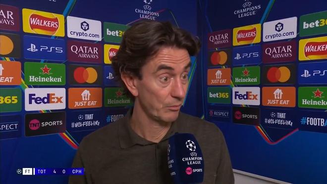 率隊(duì)在歐冠聯(lián)賽階段第4輪主場(chǎng)4-0大勝哥本哈根之后,托特納姆熱刺主教練托馬斯-弗蘭克接受了來自TNT體育的采訪。